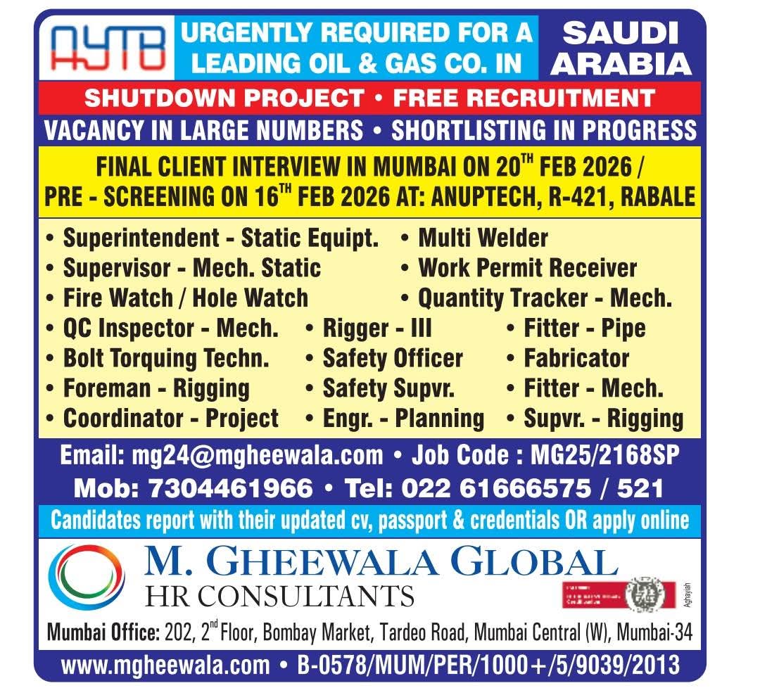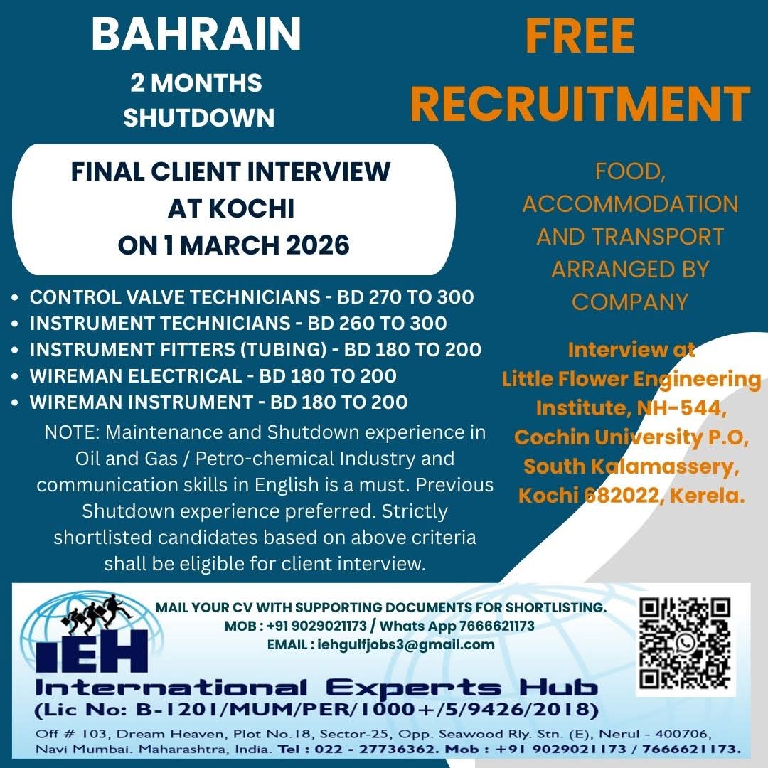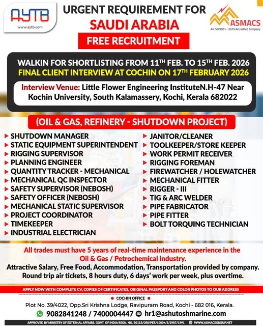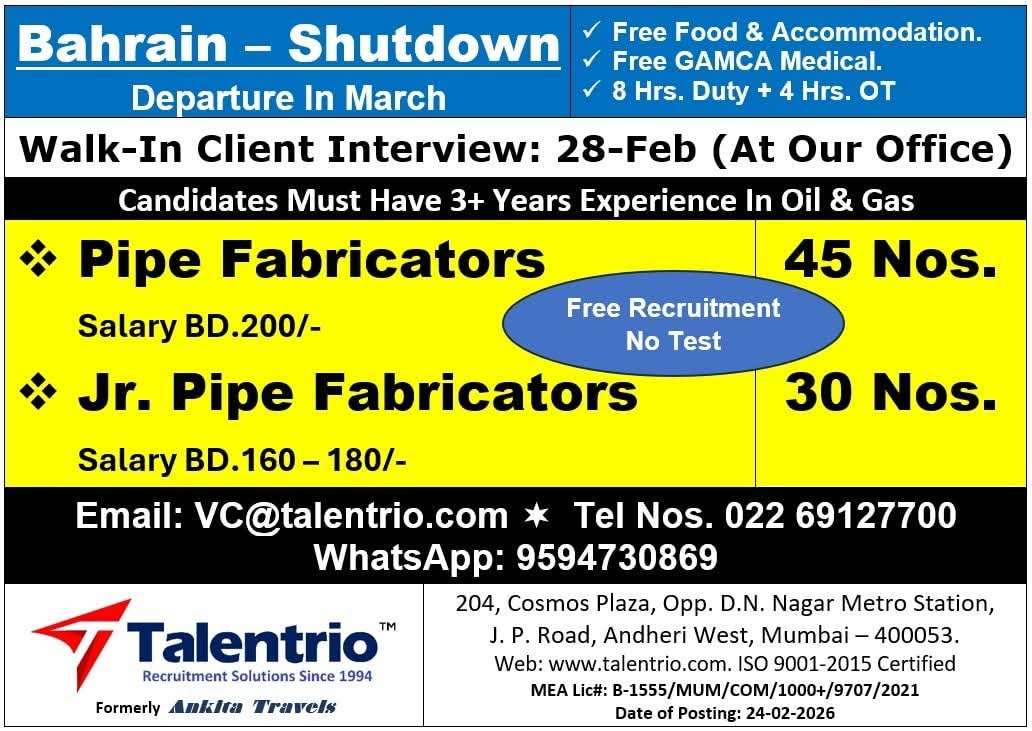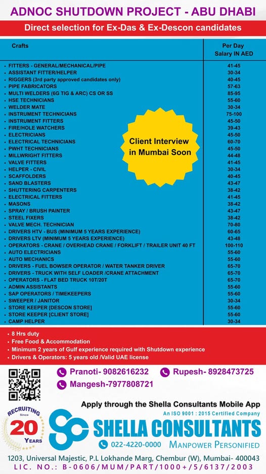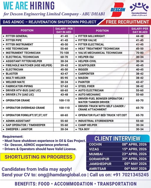 Jobs in abudhabi For all above candidates min. age 24 yrs with exp. in min. 2 shutdowns. Interested candidates to Attend prescreening