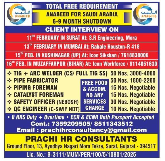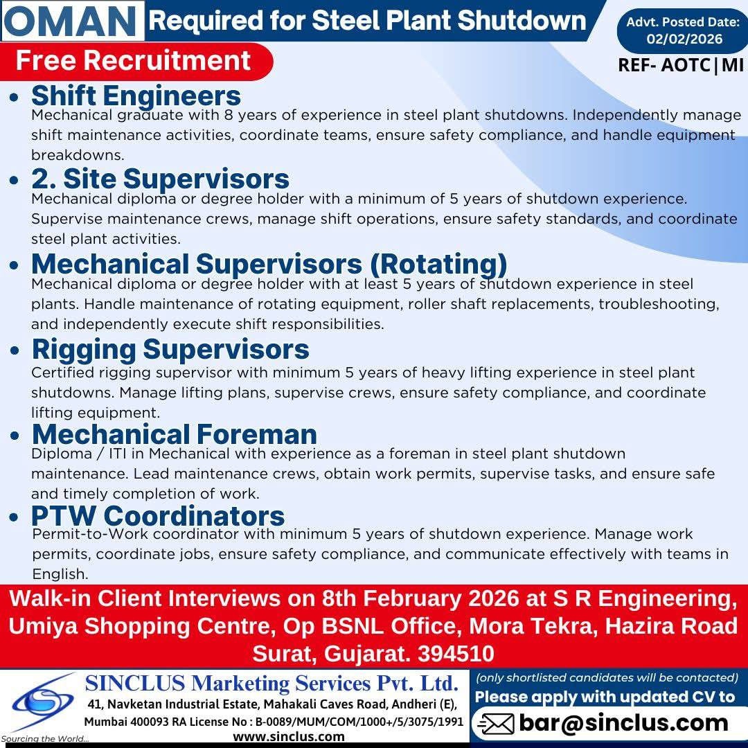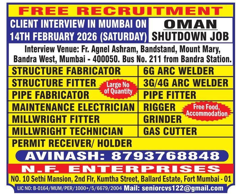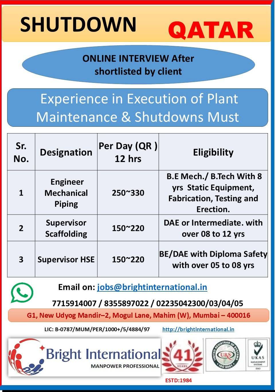 Jobs in abudhabi For all above candidates min. age 24 yrs with exp. in min. 2 shutdowns. Interested candidates to Attend prescreening