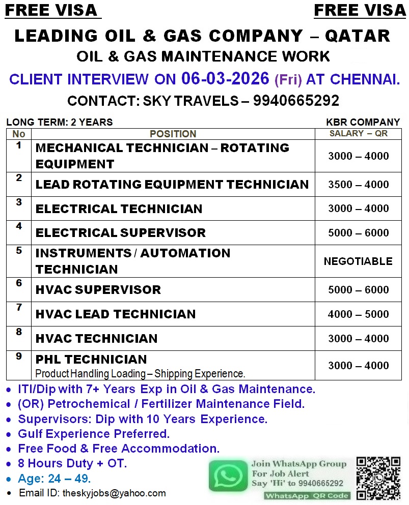 Urgently Required For Leading Company – Qatar.