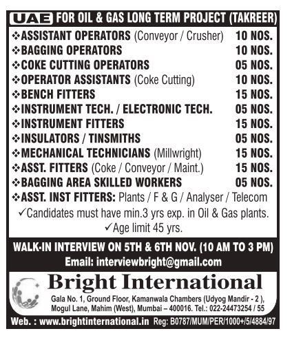 – WALK-IN INTERVIEW ON 5TH & 6TH NOV. (10 AM TO 3 PM)