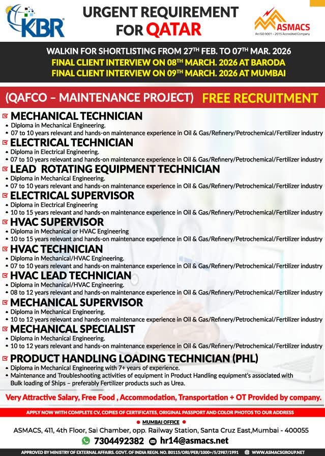 | supervisors( static-mechanical)/foreman(mechanical)/supervisors safety/hole watch/supervisor safety watch/manhole watch/supervisors fire watch/fire watch supervisor (mechanical-static)/PTW coordinator/fitter(tray)/torqueing technician/mechanical technician/millwright technician/structural fitter. SUPERVISORS MUST HAVE DIPLOMA/FORMAN&TECHNICIANS MUST HAVE ITI MIN:-3YRS EXPERIENCE IN OIL &GAS/REFINERIES/PETROCHEMICALS. |