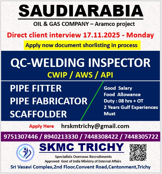A JOB OPENING FOR QC WELDING INSPECTOR (CWIP/ AWS/ API) – 2 yrs GULF EXPERIENCES MUST